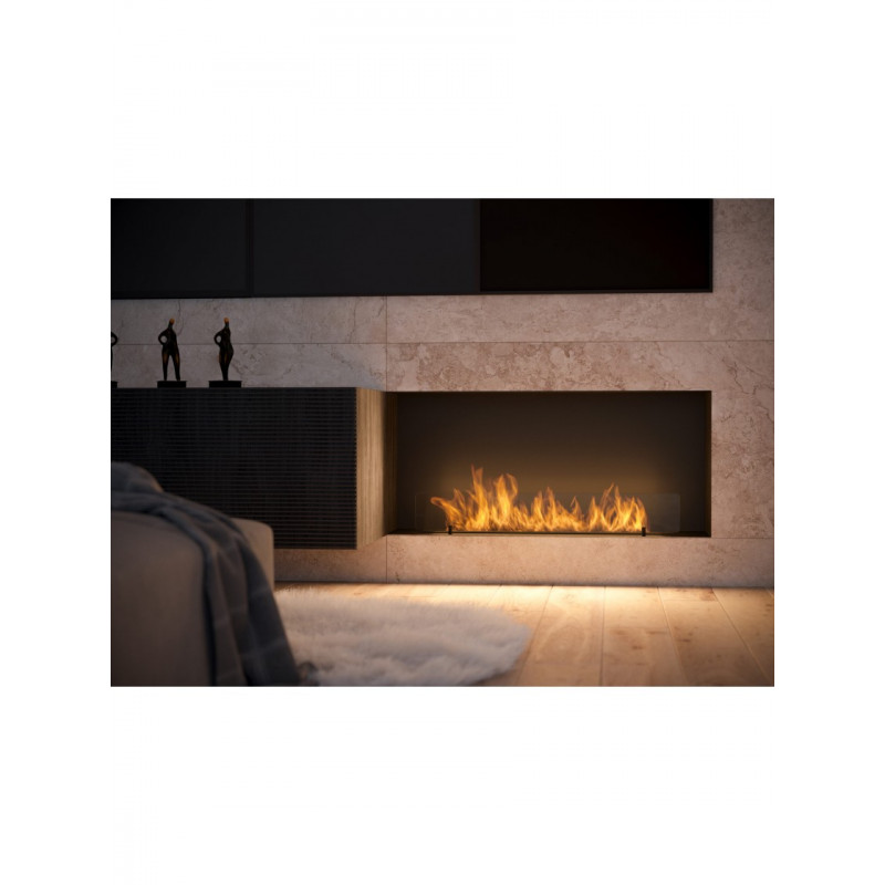 INSIDE C1000 VERS1 - камін, призначений для установки в підготовлену нішу. Завдяки використанню спеціальної армованої котлової сталі вдалося отримати максимально мінімалістичну форму, використовуючи лише один шар сталі. Конструкція каміна дозволяє спостерігати за вогнем з трьох сторін.