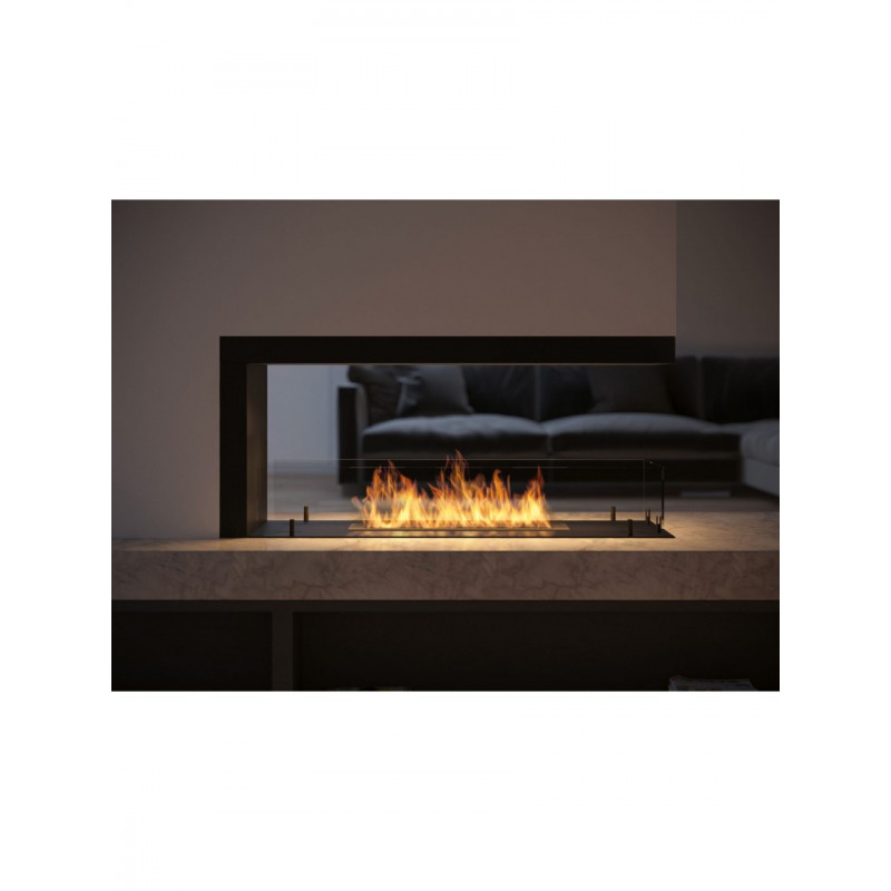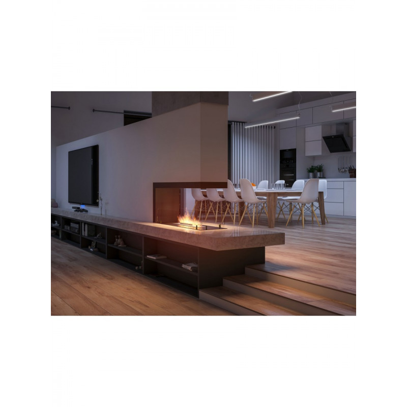 Модель INSIDE U 1000.1 – це камін, який встановлюється в підготовлену нішу. Це найбільш широка доступна вбудована модель. Каркас каміна оснащений вентиляційною системою, яка запобігає створенню тиску під пальником у разі переливу палива; також має вбудований утеплювач, що дозволяє безпечно монтувати його, наприклад, в будівлі з МДФ або гіпсокартону. Рама має 3 скла, засунуті в спеціальні рейки, що дозволяє приховати всі кріплення. Камін може бути красивим і ефективним сполучником між двома кімнатами.