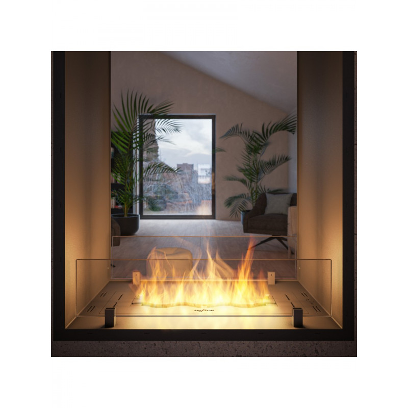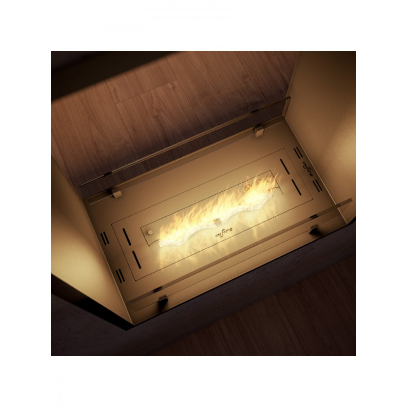Вставка з керамічного волокна з сіткою підвищує безпеку, продовжує та оптимізує процес горіння. Розсувна планка дозволяє регулювати розмір полум'я і безпечно гасити камін, а форма хвилі створює додатковий 3D ефект. Також пальник має систему вентиляції, яка запобігає створенню тиску під пальником у разі переповнення палива. Додатковий резервуар під пальником гарантує більшу безпеку в разі витоку палива за межі пальника.