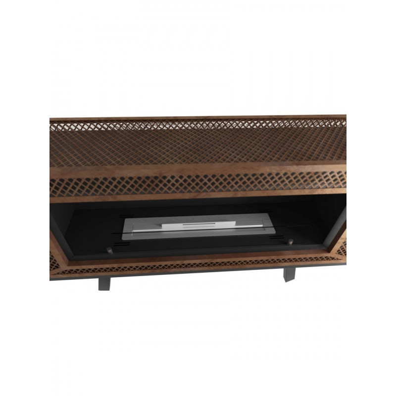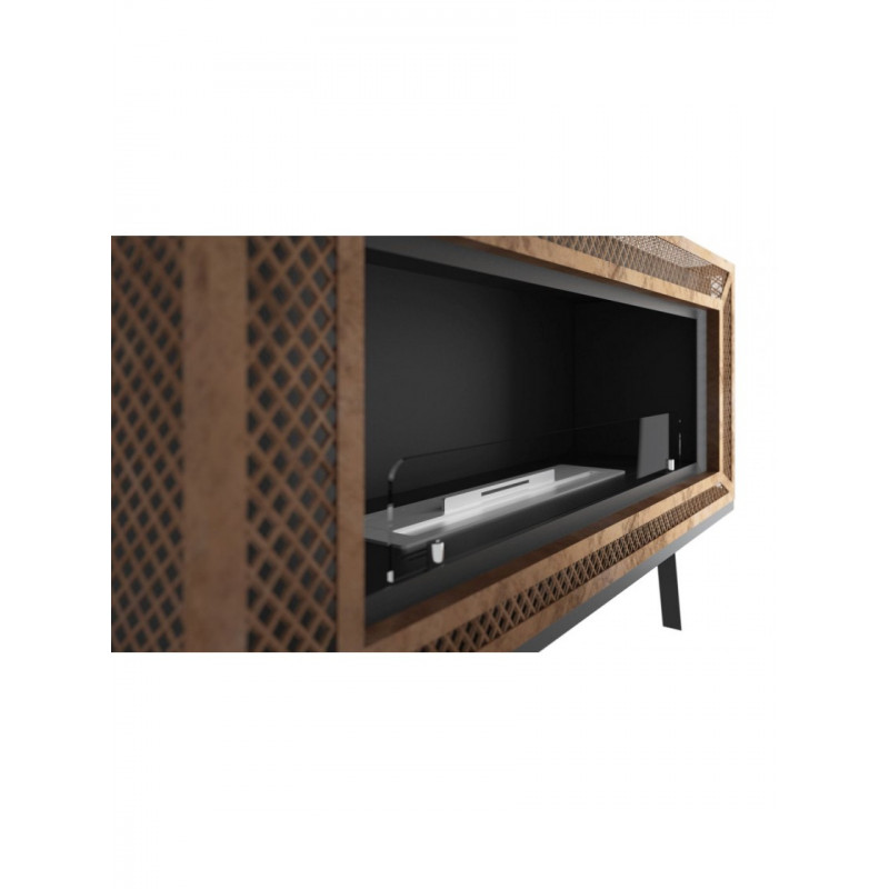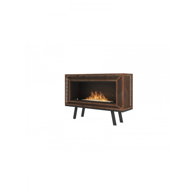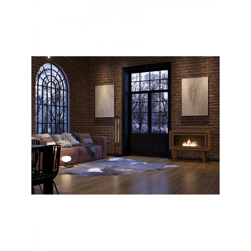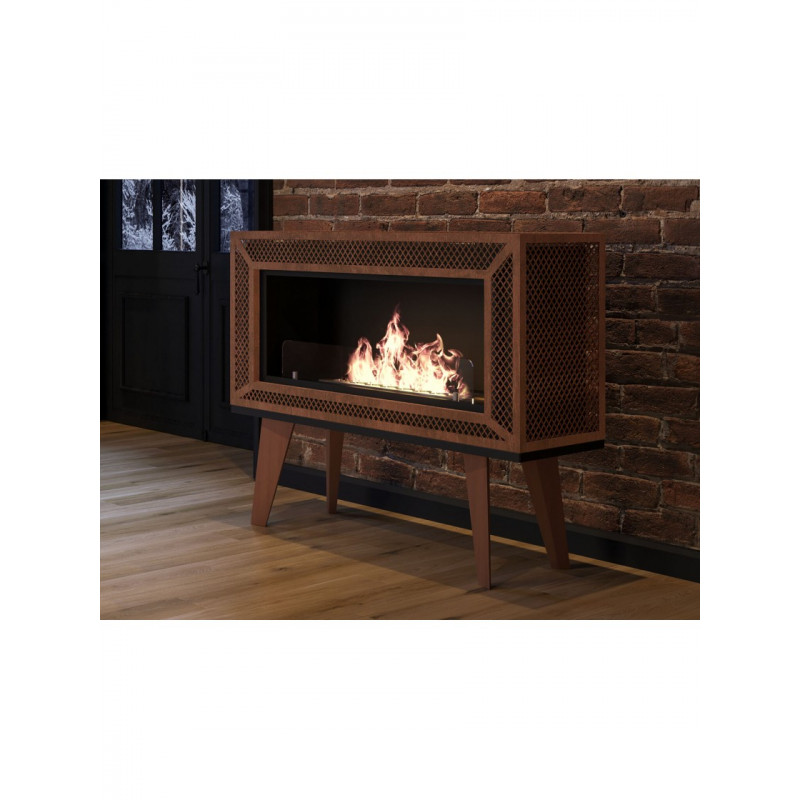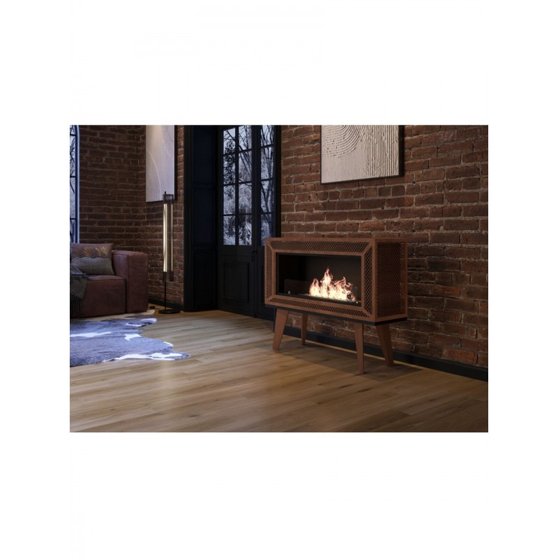 Камін, який дуже підходить для інтер'єру лофт, але не тільки. Також відмінно виглядає в сучасних, дерев'яних і класичних інтер'єрах. У нього дерев'яні ніжки в стилі PRL і сітка. Його можна поставити до стіни, але він відмінно виглядає в центрі кімнати завдяки полірованої обробці навколо цієї моделі.
