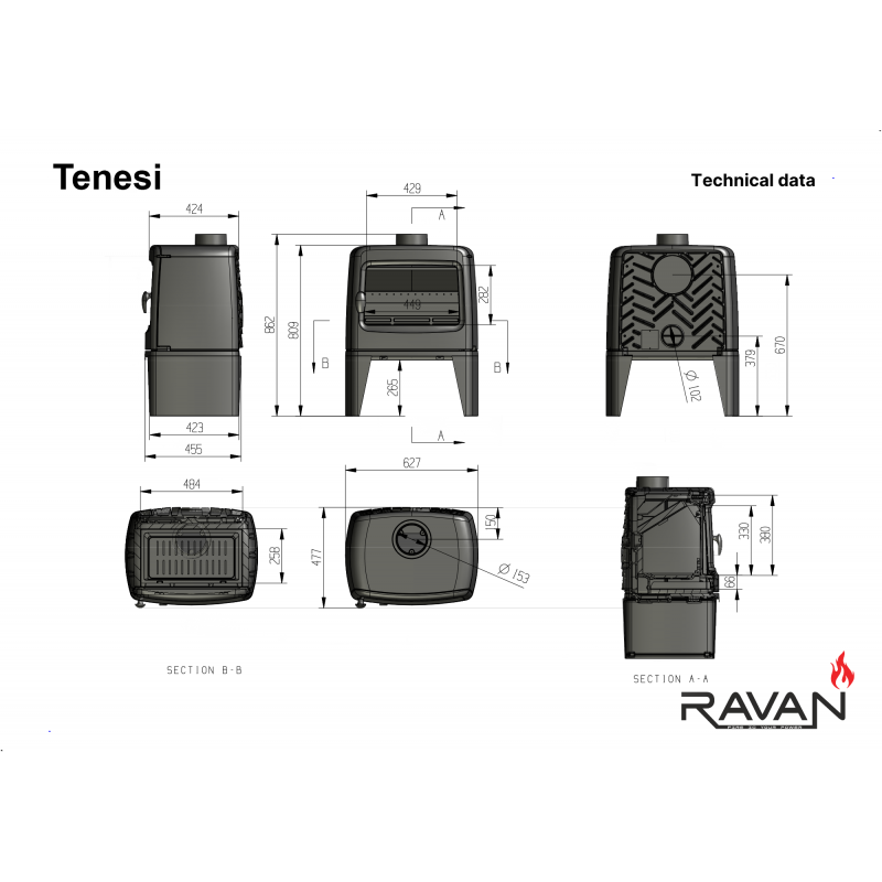 Чавунна дров’яна піч-камін Ravan Tenesi 14 кВт