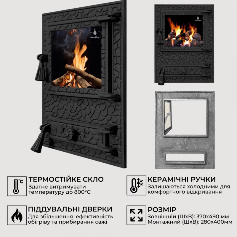 Чавунні дверцята для печі Iron Fire Vision — це якісне рішення для камінів, печей та барбекю. Вони оснащені вогнетривким склом Robax (4 мм), витримують до 800 °C, мають регулятор тяги й керамічну ручку. Завдяки герметичності та високій теплоємності чавуну дверцята підвищують ефективність печі до 50% і забезпечують економію палива. Модель має розмір 370х490 мм та розміри для монтажу 280х400 мм. | ![]() |