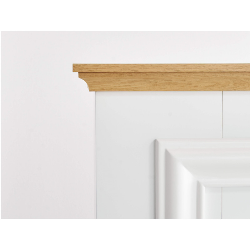 Матеріал камінного порталу – МДФ – здатний витримувати не лише значні перепади температур і підвищену вологість, але й більш стійкий до навантажень, ніж аналоги з цільної деревини. Портал покритий декількома шарами фарби та лаку.