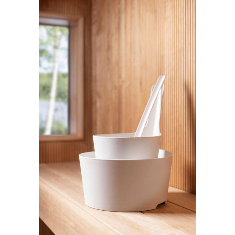 Набір Rento Pisara білого кольору — це елегантне рішення для комфортного і безпечного паріння, створене у Фінляндії з урахуванням найвищих стандартів якості. Він включає в себе шайку та черпак з довгою ручкою — усе, що потрібно для повноцінного ритуалу у лазні чи сауні.