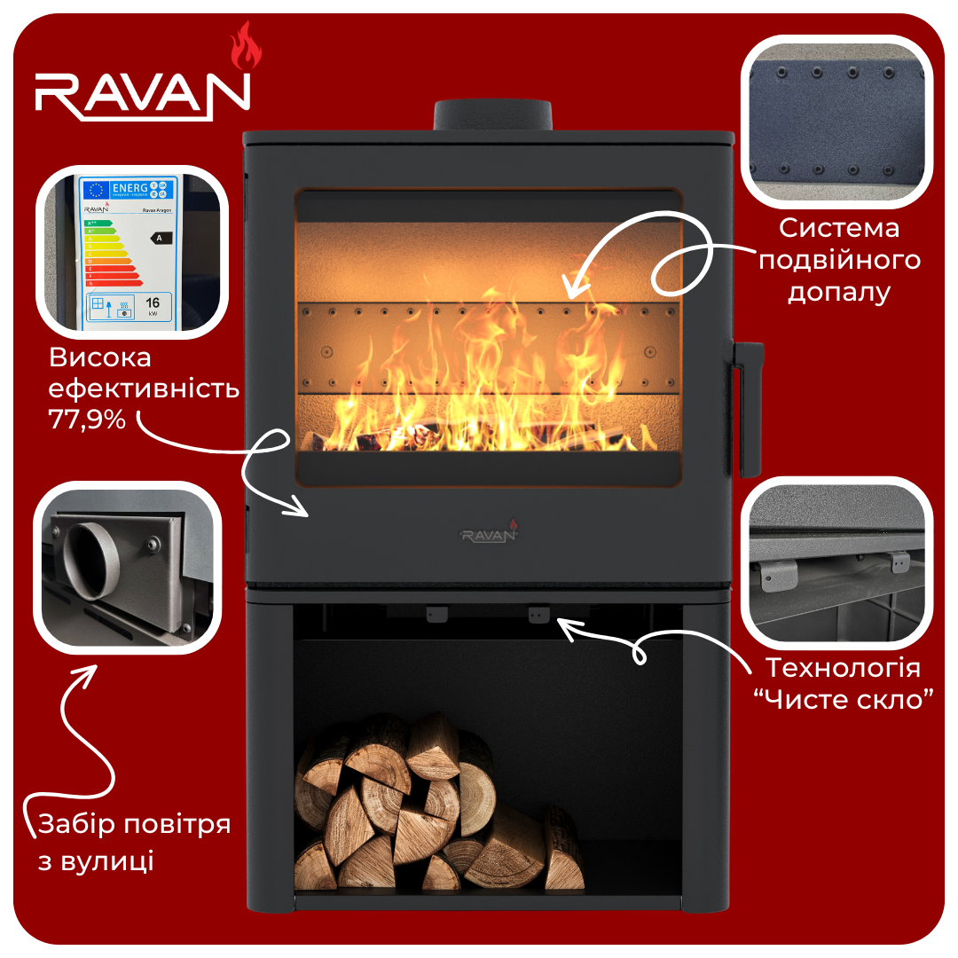 ![]() | Система двойного дожига Дровяная печь-камин Ravan Aragon оснащена системой двойного дожига, благодаря которой несгоревшие частицы топлива сгорают повторно. Это существенно снижает расходы на отопление. Подвод воздуха с улицы Благодаря внешнему забору воздуха, печь горит, не забирая воздух из помещения. Это способствует лучшей вентиляции и здоровому микроклимату в доме. Система "Чистое стекло" Поток воздуха, поступающий в камеру сгорания, обдувает стекло, сохраняя его чистым. Это позволяет наслаждаться пламенем без необходимости частой чистки. Высокая эффективность КПД 77.9% означает, что почти вся энергия от сгорания дров используется для обогрева дома. Вы не тратите дрова впустую и экономите на отоплении. |