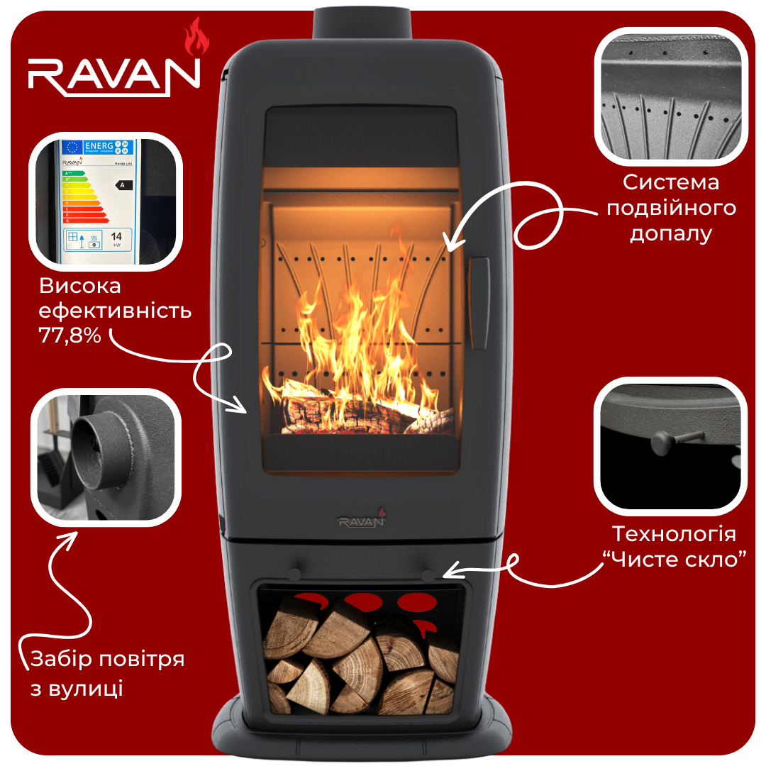 ![]() | Система двойного дожига Печь-камин на дровах Ravan Incorta Pro имеет систему двойного дожига, благодаря которой несгоревшие частицы топлива дожигаются повторно. Это позволяет значительно снизить расходы на отопление. Подача воздуха снаружи Благодаря подаче воздуха с улицы печь горит, не забирая воздух из помещения. Это способствует лучшей вентиляции и здоровому микроклимату в доме. Система "Чистое стекло" Воздух, поступающий в камеру сгорания печи, обдувает стекло, сохраняя его чистым. Вы сможете наслаждаться пламенем, не тратя время на частую чистку стекла. Высокая эффективность КПД 77.8% означает, что почти вся энергия от сжигания дров используется для обогрева вашего дома. Вы не тратите дрова впустую, тем самым экономите на отоплении. |
