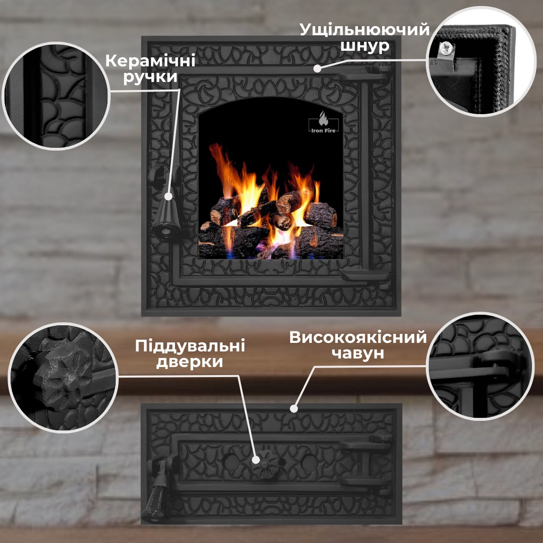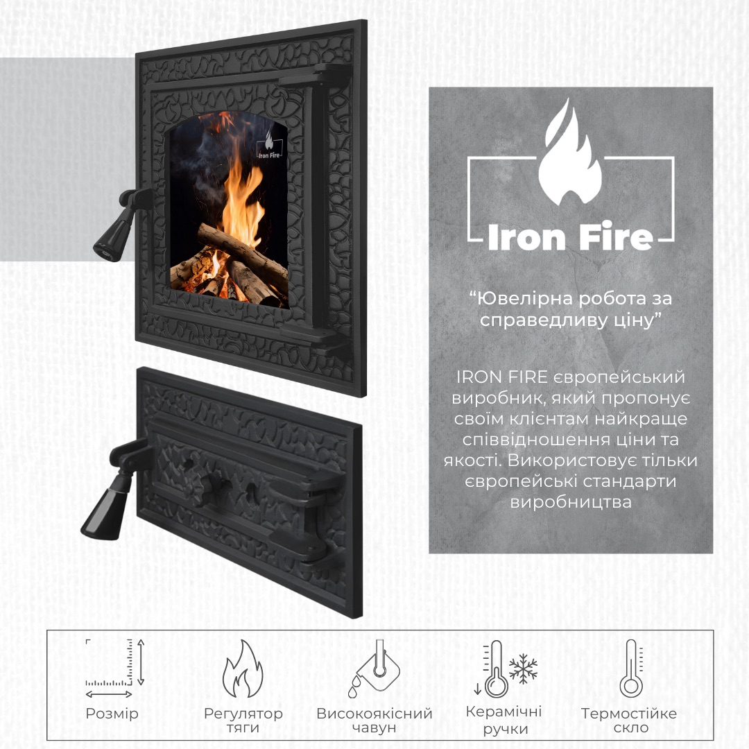 Комплект дверцы чугунной для камина/барбекю Iron Fire Bastion S 370х400 мм с огнеупорным стеклом Robax + поддувальная Bastion 375х175 мм