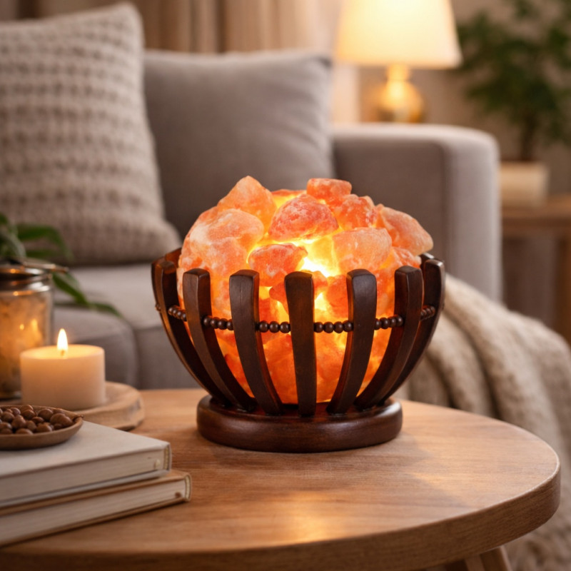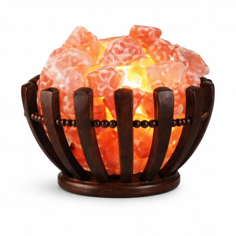 Світильник Кошик дерев’яний з соляним камінням (20×20×11,5 см) — це поєднання преміальних природних матеріалів: масиву натурального дерева та автентичної рожевої гімалайської солі. Дерев’яна чаша слугує надійною основою для необроблених кристалів солі, кожен з яких має унікальну форму та природний мінеральний відтінок. При увімкненні пристрій випромінює м’яке бурштинове світло, яке проходить крізь грані солі, створюючи в приміщенні атмосферу спокою та комфорту.