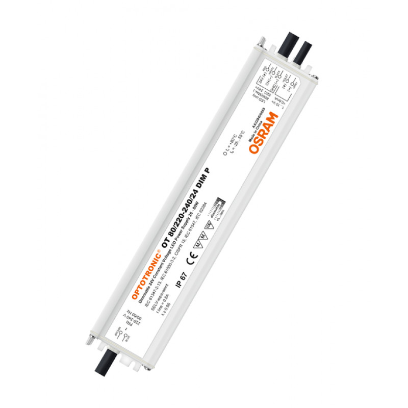 OSRAM Optotronic OT 80/220-240/24 DIM P – універсальний блок живлення для 24 В LED-систем, створений для забезпечення стабільного освітлення з можливістю повного контролю яскравості. Завдяки потужності 80 Вт, герметичному корпусу з класом захисту IP67 та вбудованому інтерфейсу димування, він стає ідеальним варіантом для монтажу в різних умовах.
