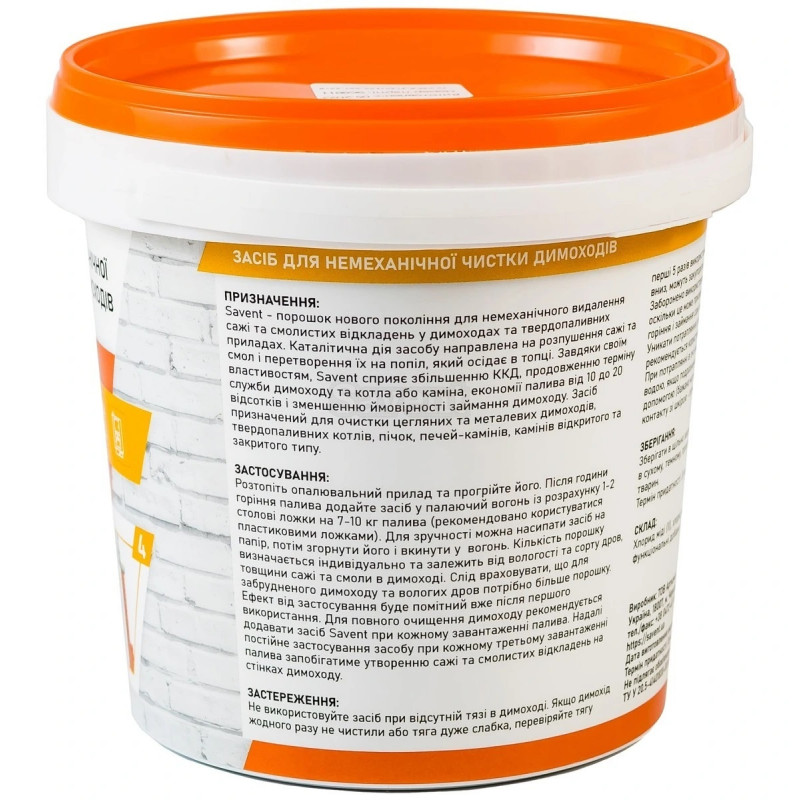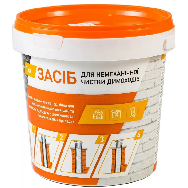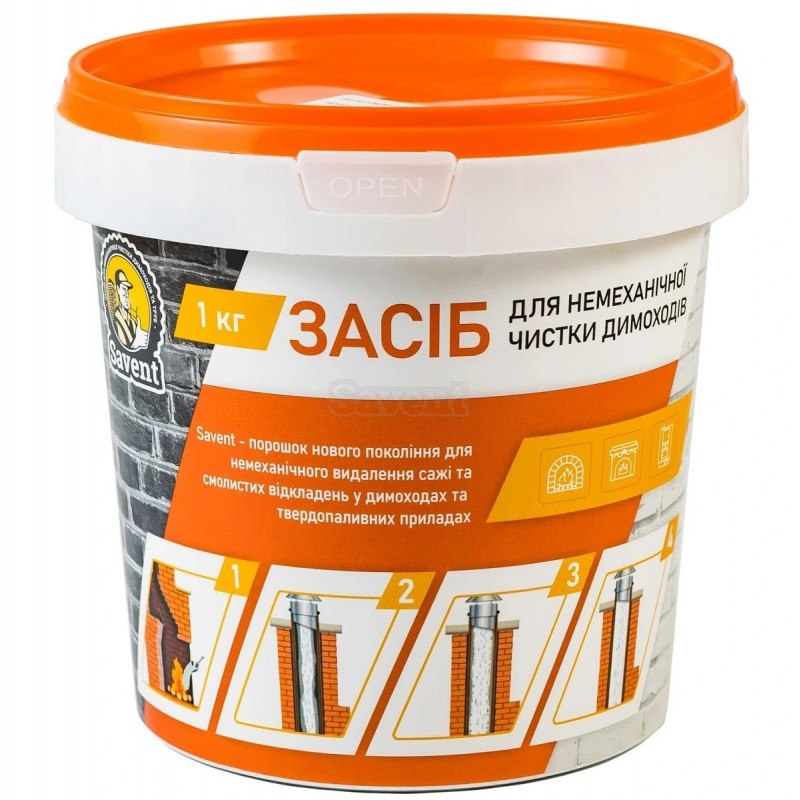 Savent 1 кг – порошок нового покоління для немеханічного видалення сажі та смолистих відкладень в димоходах та твердопаливних приладах. Каталітична дія засобу направлена на розпушення сажі та смол і перетворення їх на попіл, який осідає в топці. Завдяки своїм властивостям, Savent сприяє збільшенню ККД, продовженню терміну служби димоходу та котла чи каміна, економії палива від 10 до 20% і зменшенню ймовірності займання димоходу. Засіб призначений для очищення цегляних та металевих димоходів, твердопаливних котлів, пічок, печей-камінів, камінів відкритого та закритого типу.